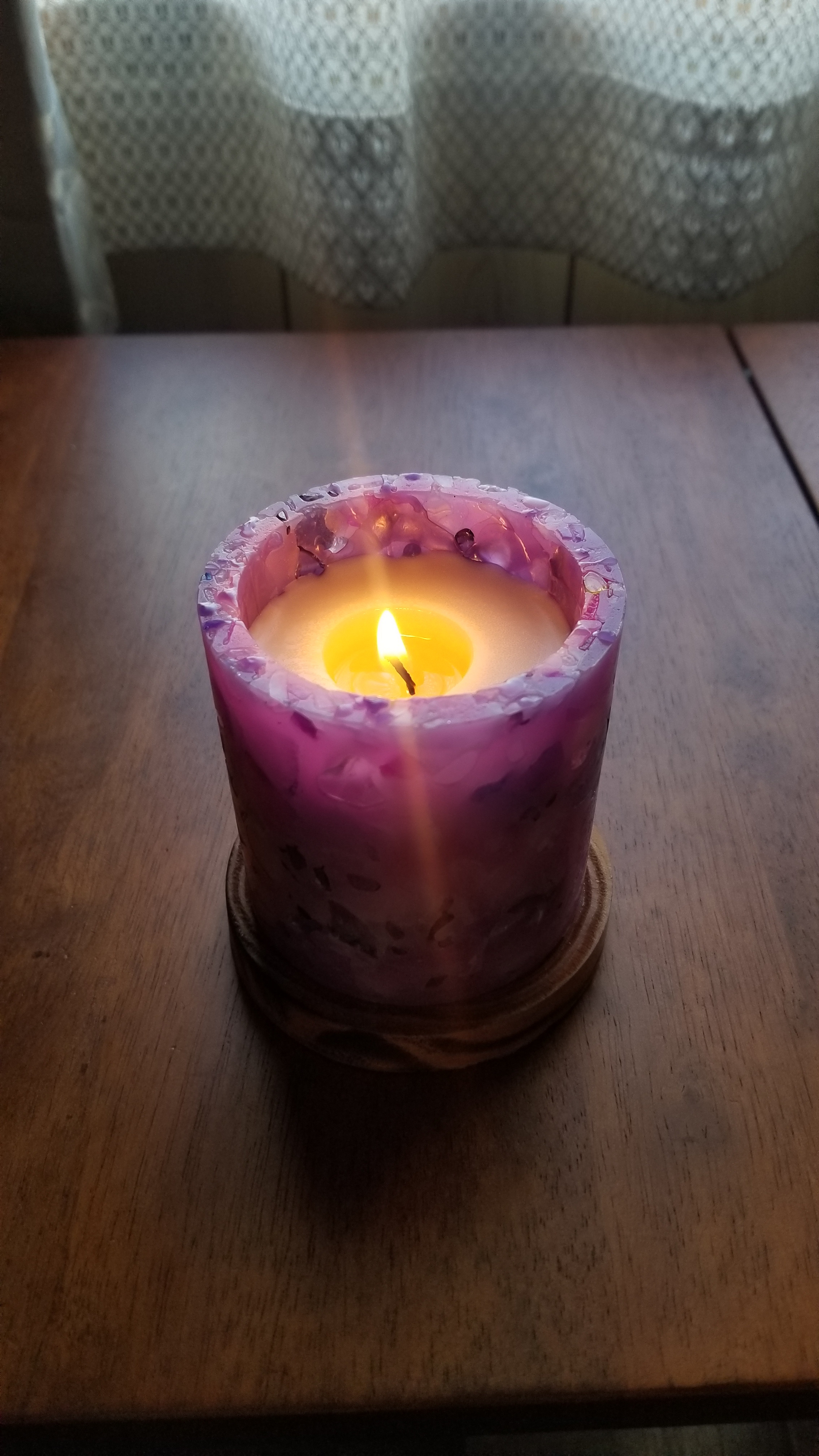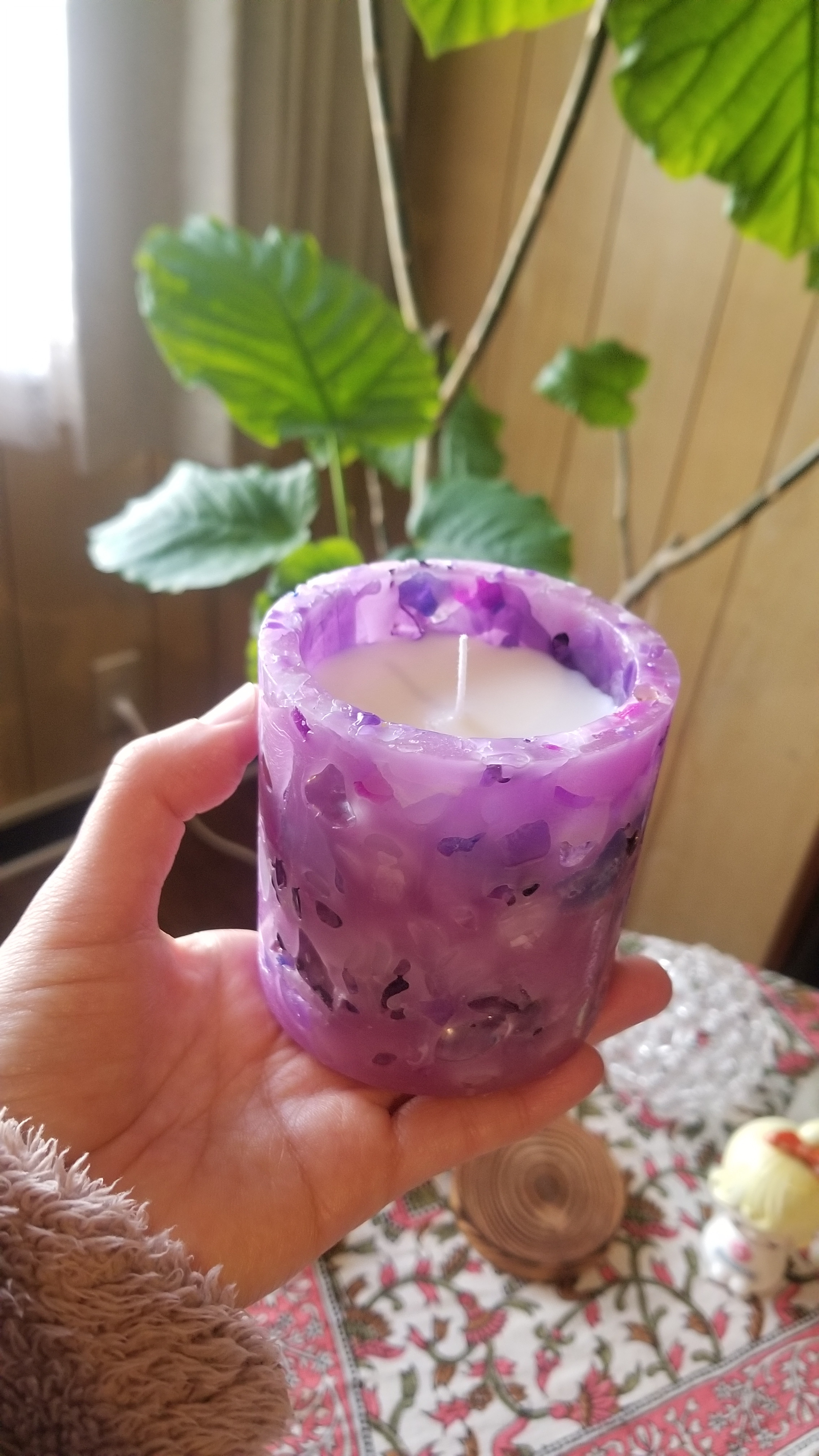 水晶、アメジスト、パロサント、ジュニパーベリー、ラベンサラ、ホワイトセージ、ロードデンドロンの精油を入れたソイキャンドルを作りました🐱